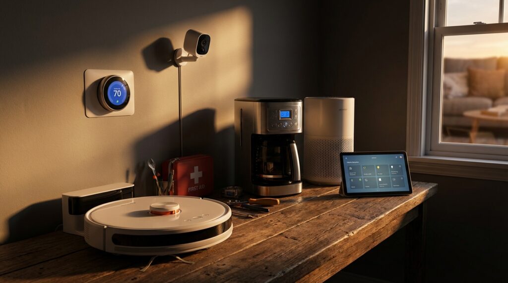 Besonders wichtig sind Notrufsysteme, automatische Herdabschaltungen und Sturzsensoren. Diese Geräte bieten Sicherheit, falls im Alltag Unfälle passieren. Auch Saugroboter sind sehr hilfreich, da sie das mühsame Bücken und schwere Heben bei der Bodenreinigung überflüssig machen.